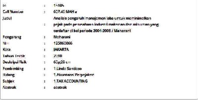 Maharani, Maharani (2010) Analisis pengaruh manajemen laba untuk meminimalkan pajak pada perusahaan industri makanan dan minuman yang terdaftar di bei periode 2004-2008. Informasi Detail Skripsi/Thesis. p. 65. ISSN 125060066