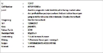 Ivana Rusli, DeeDee (2010) Analisis pengaruh modal intelektual terhadap market value dan profitabilitas pada perusahaan industri sektor keuangan yang terdaftar di bursa efek indonesia. Informasi Detail Skripsi/Thesis. p. 93. ISSN 125060517