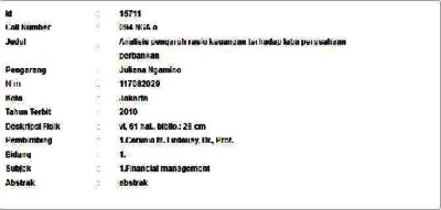 Ngamino, Juliana (2010) Analisis pengaruh rasio keuangan terhadap laba perusahaan perbankan. Informasi Detail Skripsi/Thesis. p. 61. ISSN 117082029