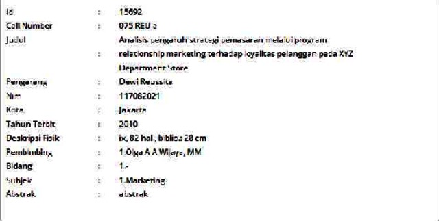 Reussita, Dewi (2010) Analisis pengaruh strategi pemasaran melalui program relationship marketing terhadap loyalitas pelanggan pada XYZ Department Store. Informasi Detail Skripsi/Thesis. p. 82. ISSN 117082021