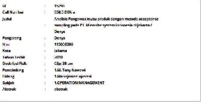 Denys, Denys (2010) Analisis Pengawas mutu produk dengan metode acceptance sampling pada PT. klien-rite system indonesia di jakarta. Informasi Detail Skripsi/Thesis. p. 62. ISSN 115050399