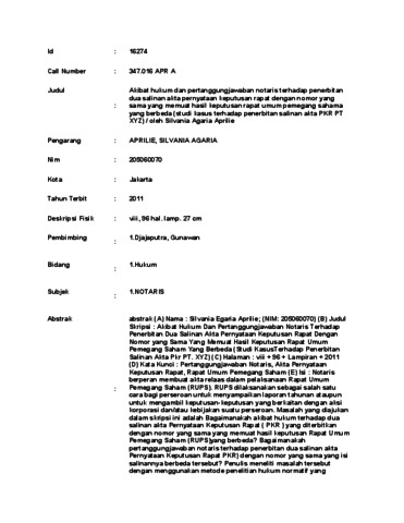 SILVANIA AGARIA, APRILIE Akibat hukum dan pertanggungjawaban notaris terhadap penerbitan dua salinan akta pernyataan keputusan rapat dengan nomor yang sama yang memuat hasil keputusan rapat umum pemegang sahama yang berbeda (studi kasus terhadap penerbitan salinan akta PKR PT XYZ) / oleh Silvania Agaria Aprilie. skripsi.