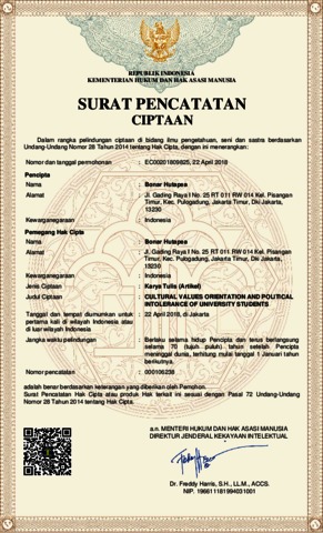 Karya Tulis (2018) CULTURAL VALUES ORIENTATION AND POLITICAL INTOLERANCE OF UNIVERSITY STUDENTS. 000106238.