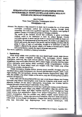 Mularsih, Heni (2012) PEMANFAATAN KONFORMITAS KELOMPOK UNTUK MBNUMBUHKAN MOTIVASI BELAJAR SISWA MELALUI KONSELING DENGAN SOSIODRAMA. PEMANFAATAN KONFORMITAS KELOMPOK UNTUK MBNUMBUHKAN MOTIVASI BELAJAR SISWA MELALUI KONSELING DENGAN SOSIODRAMA, 16 (1). pp. 1-10.