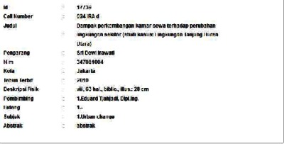 Irawati, Sri Dewi (2010) Dampak perkembangan kamar sewa terhadap perubahan lingkungan sekitar (studi kasus: Lingkungan Tanjung Duren Utara). Masters thesis, Universitas Tarumanagara.