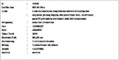 Cresnatasia, Arini Dwi (2010) Evaluasi penerapan pengendalian internal atas penjualan angsuran, piutang dagang, dan penerimaan kas - studi kasus pada PT. primadelta starlestari. Informasi Detail Skripsi. p. 86. ISSN 125060007