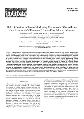 Lianto, Fermanto and Arifin, Lilianny Sigit and Dwisusanto, Y. Basuki (2017) Role of Corridor in Territorial Meaning Formation in “Owned Low-Cost Apartments” (‘Rusunami’) Bidara Cina, Jakarta, Indonesia. International Journal on Advanced Science, Engineering and Information Technology, 7 (2). pp. 399-405. ISSN 2088-5334