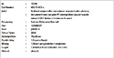 Christianto Kusnadi, Nathan (2010) Evaluasi pengendalian manajemen atas penjualan, piutang dan penerimaan kas pada PT. metropolitan bayutama pada tahun 2009. Informasi Detail Skripsi. p. 70. ISSN 125060627