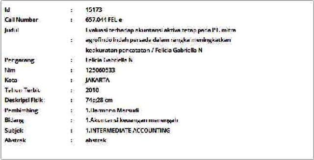 Gabriella N, Felicia (2010) Evaluasi terhadap akuntansi aktiva tetap pada PT. mitra agrofindo indah persada dalam rangka meningkatkan keakuratan pencatatan. Informasi Detail Skripsi. p. 74. ISSN 125060533
