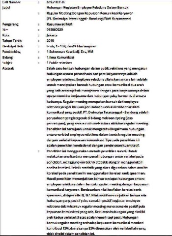 Salah satu bentuk hubungan dalam public relations yang mengatur hubungan antara perusahaan dan para karyawannya adalah employee relations. Employee relations dilakukan antara lain adalah untuk menciptakan bentuk hubungan atau komunikasi dua arah yang baik antara pihak manajemen dengan para karyawannya dalam upaya membina kerjasama dan hubungan yabg harmonis di antara keduanya. Regular meeting merupakan bentuk dari employee relations yang di lakukan perusahaan untuk membentuk iklim komunikasi yang positif. PT. Dwimulya Tatatunggal - Bandung adalah perusahaan yang bergerak di bidang makloon dyeing (jasa pencelupan), yang secara rutin melakukan aktivitas regular meeting. Penelitian ini bertujuan untuk mengetahui bagaimana hubungan antara variabel employee relatiions dalam bentuk regular meeting dengan variabel kepuasan komunikasi. Tipe pada penelitian ini adalah penelitian korelasional dengan pendekatan kuantitatif. Penelitian ini menggunakan metode penelitian survei. Untuk melakukan analisa data mengenai hubungan antar variabel pada penelitian, menggunakan teknik statistik dengan menggunakan analisa korelasi. Teknik statistik yang akan digunakan dalam analisa korelasi pada penelitian ini menggunakan korelasi rank spearman. Haasil penelitian menunjukkan bahwa terdapat hubungan antara employee relatiions dalam bentuk regular meeting dengan kepuasan komunikasi karyawan. Berdasarkan nilai koefisien korelasi rank spearman, didapat nilai 0,387. Nilai positif menunjukkan bahwa ada hubungan yang positif yaitu semakin positif kegiatan employee relations dalam bentuk regular meeting maka semakin positif pula kepuasan komunikasi yang ada. Kekuatan hubungan yang dimiliki oleh kedua variabel di atas adalah lemah tapi pasti. Hubungan bentuk regular meeting terhadap kepuasan komunikasi memberi kontribusi 15%, dan sisanya 85% ditentukan oleh variabel lain yang tidak diteliti dalam penelitian ini.
