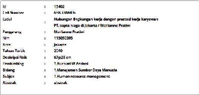 Pratiwi, Marlianne (2010) Hubungan Lingkungan Kerja dengan Prestasi Kerja Karyawan PT. Sapta Niaga di Jakarta. Skripsi thesis, Universitas Tarumanagara.