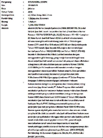 (A) Nama : Joseph Syairendra ( NIM: 205060179). (B) Judul Skripsi : Jual Beli Tanah Tanpa Alas Hak Sah. ( Studi Kasus Nomor Putusan 138/Pdt/G/2008/Pn.Jkt.Ut) (C) Halaman : VII + 88 + Lampiran (D) Kata Kunci : Jual Beli Tanah (E) Isi : Jual-beli hak atas tanah, dimana surat girik asli telah hilang pada tahun 1976 dengan Nomor.C771 persil 45 a / D II seluas 3.970 M2 a/n Marjuki.lalu pada Tahun 1976 tanah dijual kepada M.Sukojono dan tanah di jual kembali pada Tahun 1982 (2.600 M2) dan Tahun 1995 (1.370 M2) kepada H. Mochamad Abd Hilabi. Jual-beli tersebut dengan menggunakan girik fotocopy, yang menjadi masalah bagaimana dapat terjadi jual-beli tanah tanpa alas hak yang sah dapat dilakukan sebagaimana dimaksud dalam putusan perkara Nomor.138/Pdt/G/2008/Pn.Jkt.Ut.Penulis meneliti masalah tersebut dengan menggunakan metode penelitian hukum empiris, Data penelitian memperlihatkan adanya kelemahan yang di lakukan oleh H.Mochamad Abl Hilabi (penggugat) melawan PT.Subur Progress (tergugat I),dalam putusan digugat perbuatan melawan hukum,karena mengeruk, menguasai, dan menempatkan orang untuk menjaga lokasi tanah; PT. Subur Progress tidak terbukti melakukan perbuatan melawan hukun karena melakukan ditanah miliknya sendiri yang sudah bersertifikat (hak guna bangunan Nomor:1687).Sesui ketentuan UUPA Nomor.5 Tahun 1960.Apabila melakukan jual-beli hak atas tanah milik dan harus dilakukan di hadapan Notaris PPAT. Sehingga memenuhi syarat sahnya perjanjaian jual-beli yang diatur didalam Pasal 1320 KUHPerdata. Karena syarat objektif yaitu suatu hal tertentu dan sesuatu sebab yang halal bila tidak terpenuhi maka jual-beli batal demi hukum atau perjanjian yang dilakukan dianggap tidak pernah ada.Apabila jual-beli tanah telah dilakukan di pejabat notaris PPAT, pembeli wajib mendaftarkan tanah untuk mendapatkan bukti atas hak tanah,sehingga pemilik atas tanah berhak mempergunakannya dan pihak ketiga wajib menghormatinya. (F) Acuan : (2006-2010) (G) Pembimbing : Dr.Gunawan Djajaputra, SH.,SS.,MH., (H) Penulis : Joseph Syairendra,.