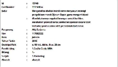 Surjanto, Aldy (2010) Menganalisa ekuitas merek serta menyusun strategi pengelolaan merek Djarum Super, guna mengantisipasi diberlakukannya regulasi larangan untuk beriklan, melakukan promosi serta pemberian sponsor secara total terhadap produk rokok oleh pemerintah Indonesia. Masters thesis, Universitas Tarumanagara.