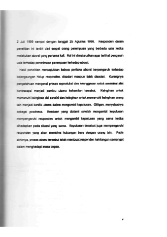 Penelitian ini berusaha menjawab: Bagaimana dinamika psikologis yang dialami oleh perempuan yang melakukan aborsi akibat kehamilan pranikah? Teori utama yang digunakan adalah teori perkembangan moral Giligan. Garis besar penelitian ini adalah perkembangan moral yang dialami oleh perempuan yang hamil pranikah ketika memutuskan untuk melakukan aborsi. Pengaruh keluarga dan pasangan sangat besar bagi responden untuk menentukan pilihan yang hendak dibuatnya mengenai kehamilannya. Ketika akhirnya responden memilih untuk melakukan aborsi, maka yang berbicara disitu adalah keinginan responden. Akan tetapi, tidak selalu keputusan yang dipilih oleh seorang perempuan adalah keinginannya sendiri. Terkadang pilihan tersebut adalah keputusan yang dibuat oleh keluarga atau pasangannya untuk perempuan tersebut. Tanpa disadari, keputusan tersebut memberi pengaruh kepada kondisi psikologi perempuan tersebut. Penelitian yang menggunakan metode wawancara mendalam dan observasi sebagai teknik tambahan berlangsung selama hampir dua bulan,antara tanggal 2 Juli 1999 sampai dengan tanggal 25 Agustus 1999. Responedn dalam penelitian ini terdiri dari empat orang perempuan yang berbeda usia ketika melakukan aborsi yang pertama. Hal ini dimaksudkan agar terlihat pengaruh usia terhadap penerimaan perempuan terhadap aborsi. Hasil penelitian ini menunjukkan bahwa perilaku aborsi berpengaruh terhadap kelangsungan hidup responden, disadari maupun tidak disadari. Kurangnya pengetahuan mengenai proses reproduksi dan keengganan untuk memakai alat kontrasepsi menjadi pemicu utama kehamilan tersebut. Keinginan untuk memenuhi keinginan diri sendiri dan keinginan untuk memenuhi keinginan orang lain menjadi konflik utama dalam mengambil keputusan. Giligan, menyebutnya sebagai goodness. Keadaan untuk mengambil keputusan yang sama ketika dihadapkan pada situasi yang sama. Keputusan tersebut juga mempengaruhi responden untuk mengambil keputusan yang sama ketika dihadapkan pada situasi yang sama. Keputusan tersebut juga mempengaruhi responden yang akan membina hubungan baru dengan orang lain. Pada akhirnya, proses aborsi tersebut telah membuat responden kehilangan semangat dalam menghadapi masa depan.