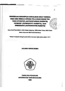 HADIKUSUMA, JULIANA (1999) PERBEDAAN KEMAMPUAN SOSIALISASI ANAK TUNGGAL PADA USIA REMAJA ANTARA POLA ASUH ORANG TUA OTORITER (AUTHORITARIAN PARENTS), PERMISIF (PERMISSIVE PARENTS) DAN DEMOKRATIS (AUTHORITATIVE PARENTS). Suatu Studi pada SMUK II, SMU Kristen Ketapang I, SMU Kristen. Skripsi thesis, UNIVERSITAS TARUMANAGARA.