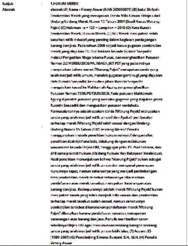 (A) Nama : Victory Aswar (NIM: 205060076) (B) Judul Skripsi : Pembatalan Merek yang merupakan Tanda Milik Umum ditinjau dari Undang-Undang Merek Nomor 15 Tahun 2001 (Studi Kasus Warung Pojok) (C) Halaman : x + 123 + Lampiran + 2010 (D) Kata Kunci : Pembatalan Merek, Hukum Merek. (E) Isi : Merek merupakan salah satu hak milik industri yang penting dalam kegiatan perdagangan barang dan jasa. Pada tahun 2008 terjadi kasus gugatan pembatalan merek yang diajukan PT. Puri Intirasa kepada Rusmin Soepadhi melalui Pengadilan Niaga Jakarta Pusat, dan menghasilkan Putusan Nomor: 22/MEREK/2008/PN. NIAGA. JKT.PST yang pada intinya menyatakan bahwa merek ?Warung Pojok? merupakan tanda yang telah menjadi milik umum, menolak gugatan ganti rugi yang diajukan oleh Rusmin Soepadhi, kemudian pihak Rusmin Soepadhi mengajukan kasasi ke Mahkamah Agung yang menghasilkan Putusan Nomor: 739K/PDTSUS/2008. Pada putusan Mahkamah Agung diperoleh putusan yang menolak gugatan yang diajukan pihak Rusmin Soepadhi dan menguatkan putusan terdahulu. Permasalahannya adalah apakah tanda ?Warung Pojok? merupakan tanda yang telah menjadi milik umum? dan Apakah pembatalan terhadap merek ?Warung Pojok? telah sesuai dengan Undang-Undang Nomor 15 Tahun 2001 tentang Merek? Penulis menggunakan metode penelitian hukum normatif dengan sifat penelitian deskriptif analistis, didukung dengan melakukan wawancara kepada Ditjen HKI, Penggugat yaitu PT. Puri Intirasa, dan ahli serta praktisi hukum di bidang hukum Hak Kekayaan Intelektual. Hasil penelitian menunjukkan bahwa ?Warung Pojok? bukan sebagai tanda yang telah menjadi milik umum dan mengenai penerapan hukumnya tepat, namun seharusnya yang menjadi pertimbangan atas pembatalan merek tersebut seharusnya dikarenakan pendaftaran atas merek tersebut merupakan keterangan atas barang dan jasa. Kesimpulannya adalah merek ?Warung Pojok? bukan merupakan tanda yang telah menjadi milik umum dan pembatalan terhadap merek tesebut sudah sesuai, namun seharusnya pembatalan tersebut dikarenakan pendaftaran merek ?Warung Pojok? dibatalkan karena pendaftaran tersebut merupakan keterangan atas barang dan jasa. Penulis memberikan saran sebaiknya Ditjen HKI agar merumuskan tentang kategori tentang tanda yang telah menjadi milik umum lebih jelas. (F) Acuan : 25 (1989-2007) (G) Pembimbing Simona Bustani, S.H., M.H. (H) Penulis Victory Aswar