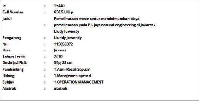 Juwendy, Liudy (2010) Pemeliharaan Mesin untuk Meminimumkan Biaya Pemeliharaan pada PT. Jaya Natural Engineering di Jakarta. Skripsi thesis, Universitas Tarumanagara.