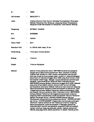 SAIMON, EFFENDY Analisis Ekonomi Dari Hukum Terhadap Permasalahan Penerapan Mediasi Perbankan Dan Eksekusi Langsung Dalam Penyelesaian Sengketa Kredit Bermasalah Di Perbankan / oleh Saimon Effendy. skripsi.
