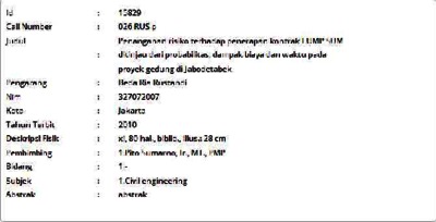 Rustandi, Beda Ria (2010) Penanganan risiko terhadap penerapan kontrak LUMP SUM ditinjau dari probabilitas, dampak biaya dan waktu pada proyek gedung di Jabodetabek. Masters thesis, Universitas Tarumanagara.