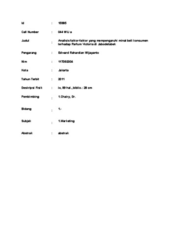 Rahardian Wijayanto, Edward (2011) Analisis faktor-faktor yang mempengaruhi minat beli konsumen terhadap Parfum Victoria di Jabodetabek. thesis.