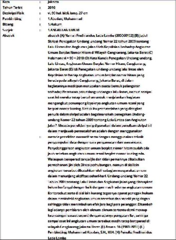 (A) Nama : Fredinandus Leda Lamba (205060162) (B) Judul Skripsi: Penegakan Undang-undang Nomor 22 tahun 2009 tentang Lalu Lintas dan Angkutan Jalan Oleh Kepolisian Terhadap Angkutan Umum Berplat Nomor Hitam di Wilayah Cengkareng, Jakarta Barat (C) Halaman : vi + 90 + 2010 (D) Kata Kunci : Penegakan Undang-undang, Lalu Lintas, Angkutan Umum Berplat Nomor Hitam, Cengkareng, Jakarta Barat (E) Isi: Penegakan undang-undang lalu lintas oleh Kepolisian terhadap angkutan umum berplat nomor hitam yang berada pada wilayah Cengkareng, Jakarta Barat, di dalam kegiatannya meskipun merupakan suatu bentuk pelangaran terhadap Peraturan perundang-undangan lalu lintas, namun sampai saat ini mereka tetap bertahan untuk menjalankan kegiatan mengangkut penumpang layaknya angkutan umum resmi yang berplat nomor kuning. Untuk itu permasalahan yang diangkat penulis dalam skripsi adalah bagaimanakah penegakan Undang-undang Nomor 22 tahun 2009 tentang Lalu Lintas dan Angkutan Jalan?. Metode penelitian yang digunakan dalam penulisan skripsi ini dalam menjawab permasalahan adalah dengan menggunakan metode penelitian normatif serta dengan menggunakan teknik pengumpulan data dengan cara pengamatan dan wawancara. Penyelenggaraan angkutan umum berplat nomor hitam sudah ada jauh sebelum angkutan umum resmi berplat nomor kuning ada. Walaupun beroperasi tanpa ijin dan tidak pernahnya dikabulkan permohonan ijin oleh Dinas perhubungan, namun di sisi lain angkutan tersebut dibutuhkan oleh sebagian masyarakat umum dalam menunjang aktifitas sehari-hari. Undang-undang Nomor 22 Tahun 2009 tentang Lalu Lintas dan Angkutan Jalan yang diterapkan belum berfungsi dengan baik dengan masih adanya angkutan umum liar tersebut serta di sisi lain kurang tegasnya aparat penegak hukum dalam menindaki angkutan umum tersebut dan sanski yang ringan sehingga tidak menimbulkan efek jera bagi para pelanggar. Ditambah lagi adanya pembiaran oleh oknum-oknum tertentu demi meraup keuntungan sesaat seperti dengan adanya pungutan liar, sehinga sampai saat ini angkutan umum tersebut masih tetap beroperasi di wilayah Cengkareng Jakarta Barat. (F) Acuan: 16 (1981-2010) (G) Pembimbing: Muhammad Abudan, S.H., M.H. (H) Penulis: Fredinandus Leda Lamba