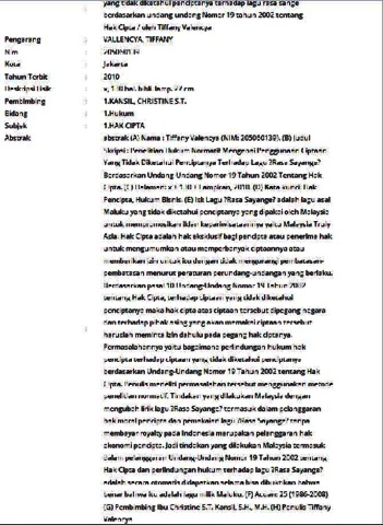 (A) Nama : Tiffany Valencya (NIM: 205060139). (B) Judul Skripsi : Penelitian Hukum Normatif Mengenai Penggunaan Ciptaan Yang Tidak Diketahui Penciptanya Terhadap Lagu ?Rasa Sayange? Berdasarkan Undang-Undang Nomor 19 Tahun 2002 Tentang Hak Cipta. (C) Halaman: x + 130 + Lampiran, 2010. (D) Kata kunci: Hak Pencipta, Hukum Bisnis. (E) Isi: Lagu ?Rasa Sayange? adalah lagu asal Maluku yang tidak diketahui penciptanya yang dipakai oleh Malaysia untuk mempromosikan iklan kepariwisataannya yaitu Malaysia Truly Asia. Hak Cipta adalah hak eksklusif bagi pencipta atau penerima hak untuk mengumumkan atau memperbanyak ciptaannya atau memberikan izin untuk itu dengan tidak mengurangi pembatasan-pembatasan menurut peraturan perundang-undangan yang berlaku. Berdasarkan pasal 10 Undang-Undang Nomor 19 Tahun 2002 tentang Hak Cipta, terhadap ciptaan yang tidak diketahui penciptanya maka hak cipta atas ciptaan tersebut dipegang negara dan terhadap pihak asing yang akan memakai ciptaan tersebut haruslah meminta izin dahulu pada pegang hak ciptanya. Permasalahannya yaitu bagaimana perlindungan hukum hak pencipta terhadap ciptaan yang tidak diketahui penciptanya berdasarkan Undang-Undang Nomor 19 Tahun 2002 tentang Hak Cipta. Penulis meneliti permasalahan tersebut menggunakan metode penelitian normatif. Tindakan yang dilakukan Malaysia dengan mengubah lirik lagu ?Rasa Sayange? termasuk dalam pelanggaran hak moral pencipta dan pemakaian lagu ?Rasa Sayange? tanpa membayar royalty pada Indonesia merupakan pelanggaran hak ekonomi pencipta. Jadi tindakan yang dilakukan Malaysia termasuk dalam pelanggaran Undang-Undang Nomor 19 Tahun 2002 tentang Hak Cipta dan perlindungan hukum terhadap lagu ?Rasa Sayange? adalah secara otomatis didapatkan selama bisa dibuktikan bahwa benar bahwa itu adalah lagu milik Maluku. (F) Acuan: 25 (1986-2008) (G) Pembimbing Ibu Christine S.T. Kansil, S.H., M.H. (H) Penulis Tiffany Valencya