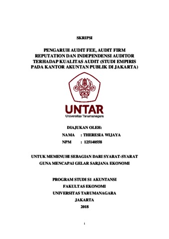Wijaya, Theresia (2018) Pengaruh audit fee, audit firm reputation dan independensi auditor terhadap kualitas audit (studi empiris pada kantor akuntan publik di Jakarta)/Theresia Wijaya. Skripsi thesis, Universitas Tarumanagara.