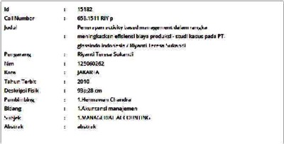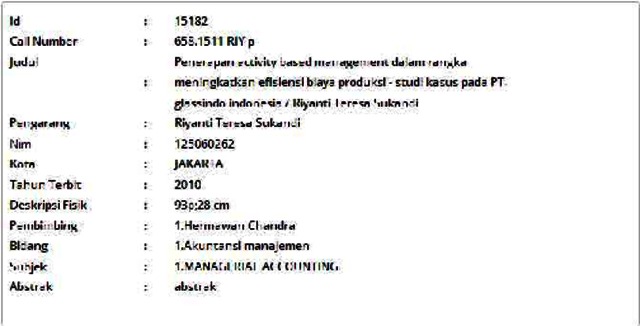 Sukandi, Riyanti Teresa (2010) Penerapan Activity Based Management dalam Rangka Meningkatkan Efisiensi Biaya Produksi - Studi Kasus pada PT. Glassindo Indonesia. Skripsi thesis, Universitas Tarumanagara.