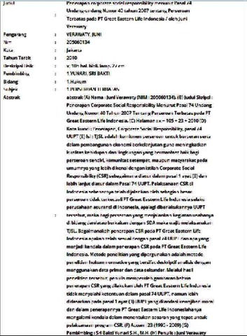 (A) Nama : Juni Verawaty (NIM : 205060134). (B) Judul Skripsi : Penerapan Corporate Social Responsibility Menurut Pasal 74 Undang-Undang Nomor 40 Tahun 2007 Tentang Perseroan Terbatas pada PT Great Eastern Life Indonesia. (C) Halaman : x + 105 + 23 + 2010 (D) Kata kunci : Penerapan, Corporate Social Responsibility, pasal 74 UUPT (E) Isi : TJSL adalah komitmen perseroan untuk berperan serta dalam pembangunan ekonomi berkelanjutan guna meningkatkan kualitas kehidupan dan lingkungan yang bermanfaat baik bagi perseroan sendiri, komunitas setempat, maupun masyarakat pada umumnya yang lebih dikenal dengan istilah Corporate Social Responsibility (CSR) sebagaimana diatur dalam pasal 1 ayat (3) dan lebih lanjut diatur dalam Pasal 74 UUPT. Pelaksanaan CSR di Indonesia sebenarnya telah dijalankan oleh sebagian besar perseroan tidak terkecuali PT Great Eastern Life Indonesia selaku perusahaan asuransi di Indonesia, apalagi diberlakukannya UUPT tersebut, maka bagi perseroan yang menjalankan kegiatan usahanya di bidang dan/atau berkaitan dengan SDA maka wajib melaksanakan TJSL. Bagaimanakah penerapan CSR pada PT Great Eastern Life Indonesia apakah telah sesuai dengan pasal 74 UUPT dan apa yang menjadi kendala dalam penerapan CSR pada PT Great Eastern Life Indonesia. Metode penelitian yang dipergunakan adalah metode penelitian hukum normative yang bersifat deskriptif analisis dengan menggunakan data primer dan data sekunder. Melalui hasil penelitian tersebut, penulis memperoleh gambaran bahwa penerapan CSR yang dilakukan oleh PT Great Eastern Life Indonesia tidak menyalahi ketentuan dalam pasal 74 UUPT, namun lebih didasarkan pada pasal 1 ayat (3) UUPT yang dilandasi kewajiban moral dan dalam penerapannya PT Great Eastern Life Indonesiahanya mengalami kendala dalam menentukan sasaran yang tepat untuk pelaksanaan program CSR. (F) Acuan : 23 (1995 - 2009) (G) Pembimbing : Sri Bakti Yunari S.H., M.H. (H) Penulis : Juni Verawaty