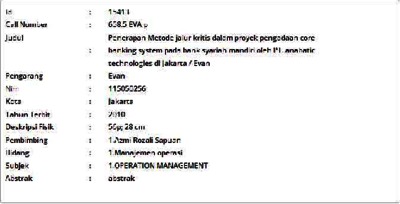 Evan, Evan (2010) Penerapan Metode Jalur Kritis dalam Proyek Pengadaan Core Banking System pada Bank Syariah Mandiri oleh PT. Anabatic Technologies di Jakarta. Skripsi thesis, Universitas Tarumanagara.
