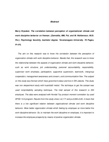Elyzabet, Merry (2006) Hubungan Antara Persepsi Iklim Organisasi Dengan Perilaku Disiplin Kerja Pada Petugas Pemadam Kebakaran. Skripsi thesis, Universitas Tarumanagara.
