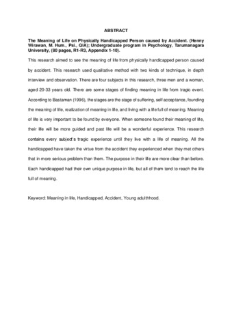 This research aimed to see the meaning of life from physically handicapped person caused by accident. This research used qualitative method with two kinds of technique, in depth interview and observation. There are four subjects in this research, three men and a woman, aged 20-33 years old. There are some stages of finding meaning in life from tragic event. According to Bastaman (1996), the stages are the stage of suffering, self acceptance, founding the meaning of life, realization of meaning in life, and living with a life full of meaning. Meaning of life is very important to be found by everyone. When someone found their meaning of life, their life will be more guided and past life will be a wonderful experience. This research contains every subject’s tragic experience until they live with a life of meaning. All the handicapped have taken the virtue from the accident they experienced when they met others that in more serious problem than them. The purpose in their life are more clear than before. Each handicapped had their own unique purpose in life, but all of them tend to reach the life full of meaning.