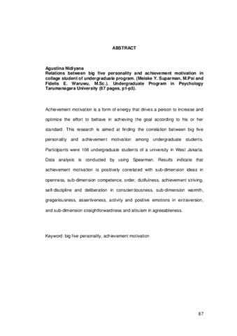 Nidiyana, Agustina (2008) Hubungan Antara Five Personality Dan Motivasi Berprestasi Pada Mahasiswa Program Studi S1. Skripsi thesis, Universitas Tarumanagara.