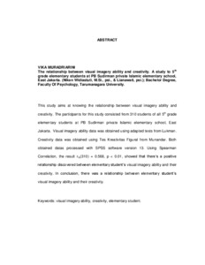 Muradriarini, Vika (2006) Hubungan Antara Kemampuan Visual Imagery Dengan Kreativitas Pada Anak Usia Sekolah Dasar. Studi Pada Siswa Kelas 5 Sekolah Dasar Islam PB Sudirman, Jakarta Timur. Skripsi thesis, Universitas Tarumanagara.