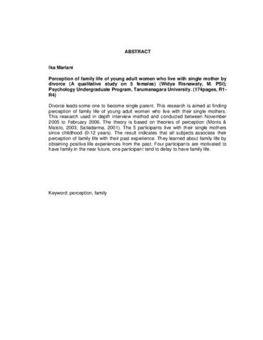 Perceraian dapat menyebabkan ayah atau ibu berperan sebagai orang tua tunggal dalam pengasuhan anaknya. Penelitian ini bertujuan untuk memperoleh gambaran persepsi mengenai kehidupan berkeluarga pada perempuan dewasa muda yang tinggal dengan ibu tunggal karena perceraian. Penelitian dilakukan dengan menggunakan metode wawancara. Penelitian berlangsung dalam rentang waktu antara November 2005 sampai Februari 2006. Teori yang digunakan adalah teori persepsi dari Satiadarma (2001) dan Morris dan Maisto (2003). Terdapat lima orang subyek dalam penelitian ini, mereka tinggal dengan ibu tunggal sejak perceraian orang tua yang terjadi ketika para subyek masih kanak-kanak (usia 0-12 tahun). Berdasarkan hasil penelitian ditemukan bahwa kelima subyek menggunakan pengalaman masa lalu, motivasi, harapan dan proses belajar sebagai proses pembentukan persepsi mengenai kehidupan berkeluarga. Kelima subyek memiliki gambaran persepsi yang relatif sama mengenai kehidupan berkeluarga. Mereka mempersepsikan kehidupan berkeluarga secara positif. Oleh karena mereka mengambil pelajaran dari pengalaman kedua orang tuanya. Berdasarkan hasil gambarannya tersebut, satu subyek tetap memiliki keinginan untuk menikah tetapi masih menundanya untuk jangka waktu yang tidak pasti. Sedangkan empat subyek lainnya memiliki keinginan yang kuat untuk menikah.