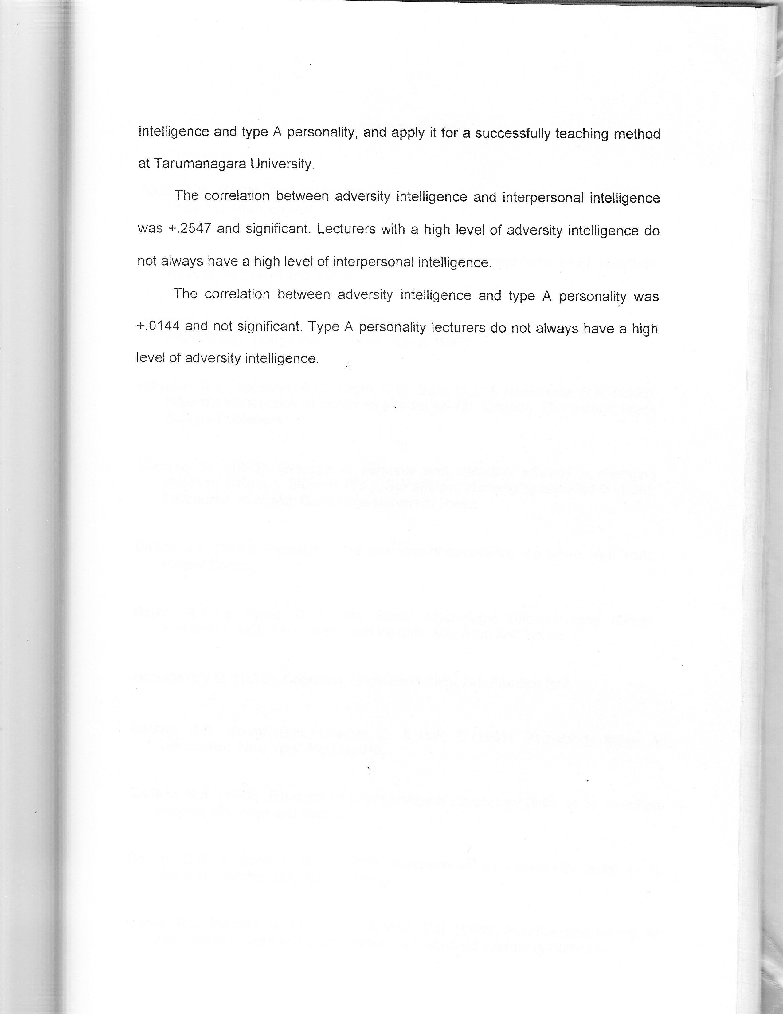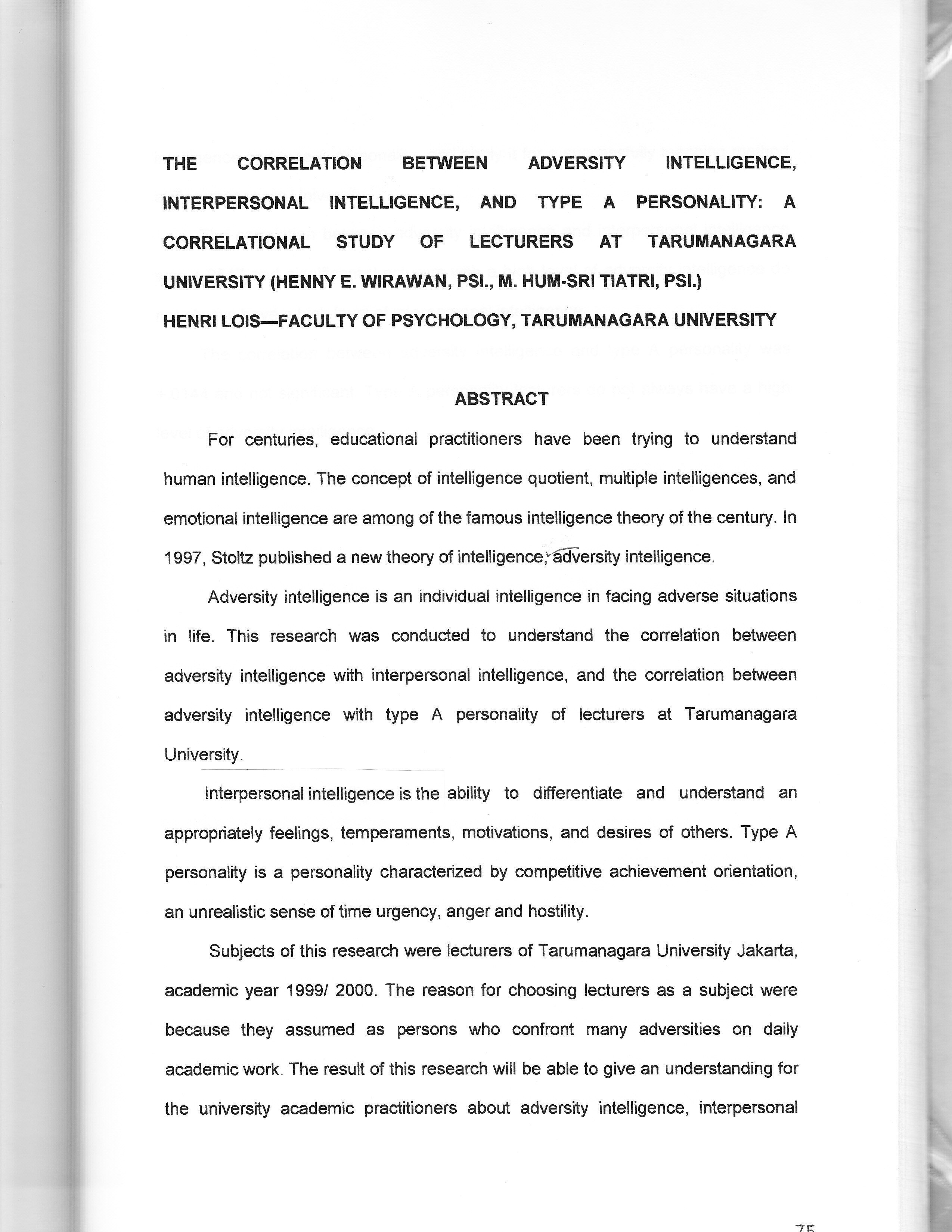 "For centuries, educational practitioners have been trying to understand human intelligence. The concept of intelligence quotient, multiple intelligences, and emotional intelligence are among of the famous intelligence theory of the century. In 1997, Stoltz published a new theory of intelligence, adversity intelligence. Adversity intelligence is an individual intelligence in facing adverse situations in life. This research was conducted to understand the correlation between adversity intelligence with interpersonal intelligence, and the correlation between adversity intelligence with type A personality of lecturers at Tarumanagara University. Interpersonal intelligence is the ability to differentiate and understand an appropriately feelings, temperaments, motivations, and desires of others. Type A personality is a personality characterized by competitive achievement orientation, an unrealistic sense of time urgency, anger and hostility. Subjects of this research were lecturers of Tarumanagara University Jakarta, academic year 19991 2000. The reason for choosing lecturers as a subject were because they assumed as persons who confront many adversities on daily academic work. The result of this research will be able to give an understanding for the university academic practitioners about adversity intelligence, interpersonal intelligence and type A personality, and apply it for a successfully teaching method at Tarumanagara University. The correlation between adversity intelligence and interpersonal intelligence was +.2547 and significant. Lecturers with a high level of adversity intelligence do not always have a high level of interpersonal intelligence. The correlation between adversity intelligence and type A personality was +.0144 and not significant. Type A personality lecturers do not always have a high level of adversity intelligence.