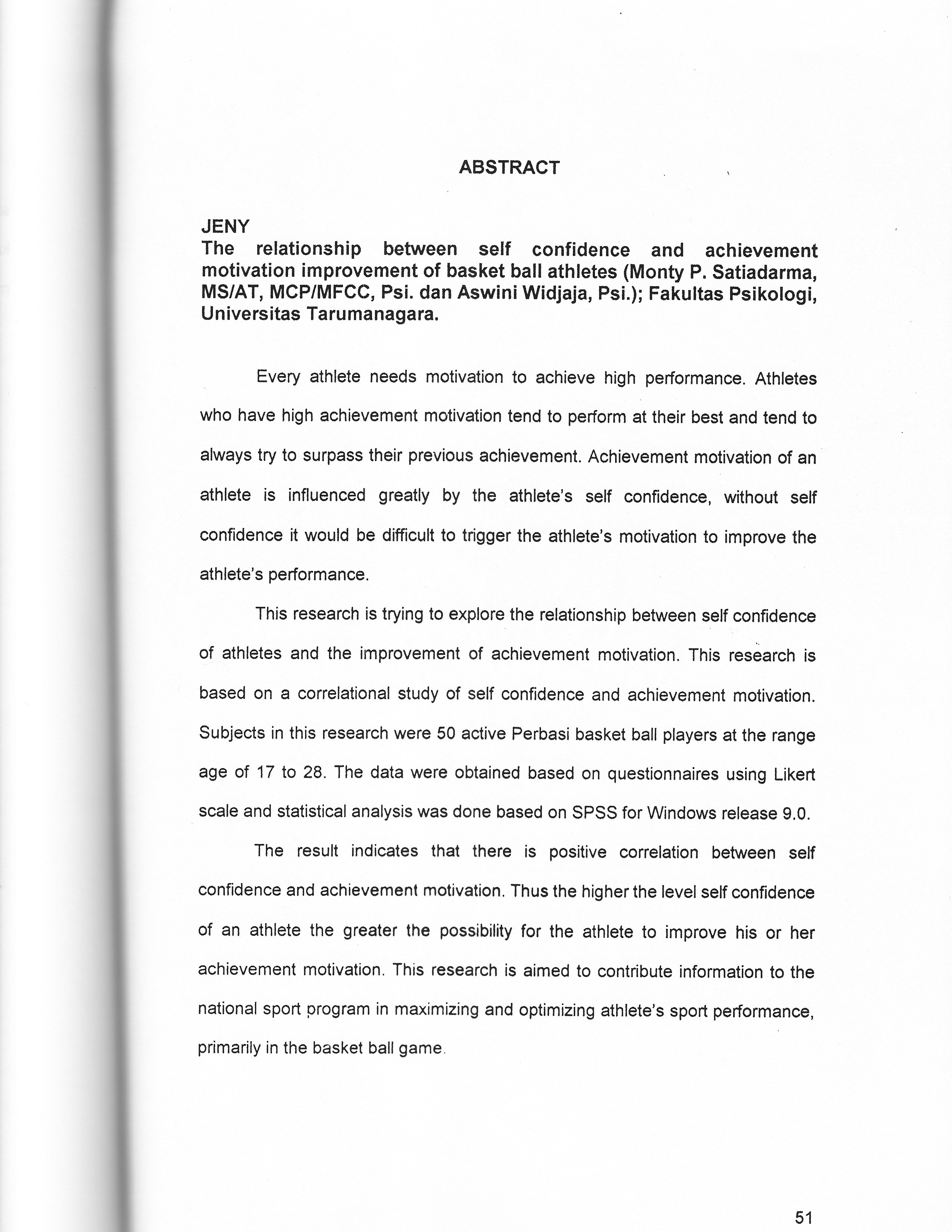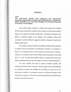 Every athlete needs motivation to achieve high performance. Athletes who have high achievement motivation tend to perform at their best and tend to always try to surpass their previous achievement. Achievement motivation of an athlete is influenced greatly by the athlete's self confidence, without self confidence it would be difficult to trigger the athlete's motivation to improve the athlete's performance. This research is trying to explore the relationship between self confidence of athletes and the improvement of achievement motivation. This research is based on a correlational study of self confidence and achievement motivation. Subjects in this research were 50 active Perbasi basket ball players at the range age of 17 to 28. The data were obtained based on questionnaires using Likert scale and statistical analysis was done based on SPSS for Windows release 9.0. The result indicates that there is positive correlation between self confidence and achievement motivation. Thus the higher the level self confidence of an athlete the greater the possibility for the athlete to improve his or her achievement motivation. This research is aimed to contribute information to the national sport program in maximizing and optimizing athlete's sport performance, primarily in the basket ball game.