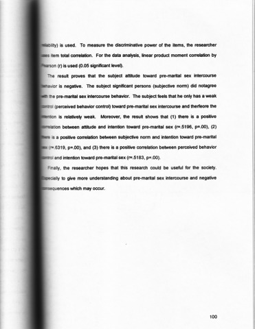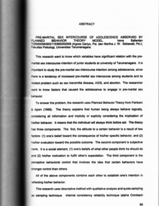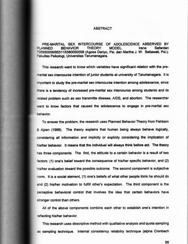 This research want to know which variables have significant relation with the pre-marital sex intercourse intention of junior students at university of Tarumanagara. It is important to study the pre-marital sex intercourse intention among adolescence, since is a tendency of increased pre-marital sex intercourse among students and its related problem such as sex transmitte disease, AIDS, and abortion. The researcher ant to know factors that caused the adolescence to engage in pre-marital sex behavior. To answer the problem, the research uses Planned Behavior Theory from Fishbein Ajzen (1988). The theory explains that human being always behave Iogically, considering all information and implicity or explicity considering the implication of his/her behavior. It means that the individual will always think before act. The theory has three components. The first, the attitude to a certain behavior is a result of two factors: (1) one's belief toward the consequence of his/her specific behavior, and (2) his/her evaluation toward the possible outcome. The second component is subjective norm. It is a social element, (1) one's beliefs of what other people think he should do and (2) his/her motivation to fulfill other's expectation. The third component is the perceptive behavioral control that involves the idea that certain behaviors have stronger control than others. All of the above components combine each other to establish one's intention in reflecting his/her behavior. This research uses descriptive method with qualitative analysis and quota sampling as sampling technique. Internal consistency reliability technique (alpha Cronbach realibility) is used. To measure the dicriminative power of the items, the researcher ises item total correlation. For data analysis, linear product moment correlation by Pearson (r) is used (0.05 significant level). The result proves that the subject attitude toward pre-martial sex intercourse behavior is negative. The subject significant persons (subjective norm) did not agree with the premarital sex intercourse behavior. The subjects feels that he only has a weak control (perceived behavior contorl) toward pre-marital sex intercourse and therefeore the intention is relatively weak. Moreover the result shows that (1) there is a postive correlation between attitude and intention toward pre-marital sex (r=.5196, p=.00), (2) there is a positive correlation between subjective norm and intention toward pre-marital sex (r=.6319, p=.00), and (3) there is a positive correlation between perceived behavior control and intention toward pre-marital sex (r=.5183, p=.00). Finally, the researcher hopes that this research could be useful for the society. Especially to give more understanding about pre-marital sex intercourse and negative consequences which may occur.