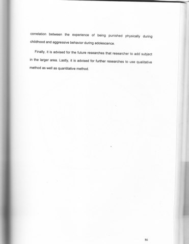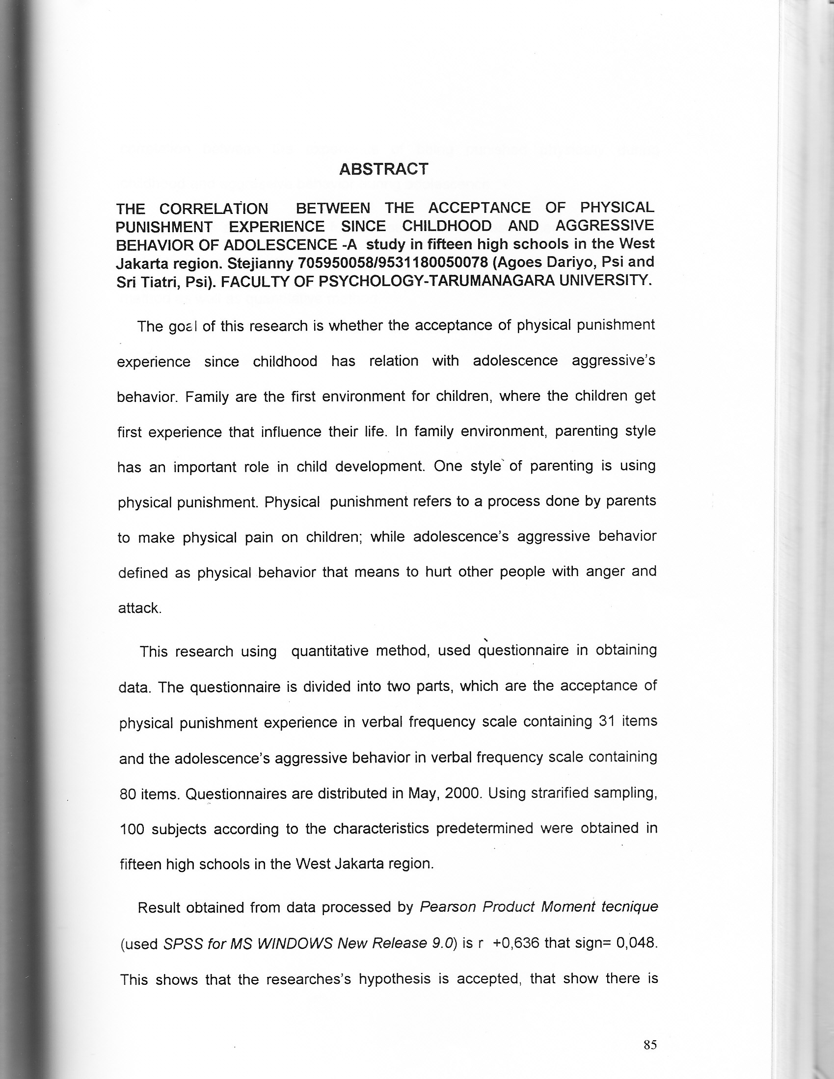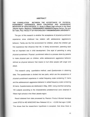 Result obtained from data processed by Pearson Product Moment tecnique (used SPSS for MS WINDOWS New Release 9.0) is r +0,636 that sign= 0,048. This shows that the researches's hypothesis is accepted, that show there is correlation between the experience of being punished physically during