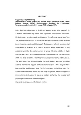 Infant death is a painful event for familiy who wants to have a child, especially for a mother. Infant death may cause some unpleasant conditions for the mother. For that reason, a mother needs social support from all resources surround her. The purpose of this study is to find the the description of social support received by mothers who experienced infant death. Social support refers to something that is perceived by a person as a comfort, attention, feeling appreciated, or any assistance provided by another person or group (Sarafino, 2008). In depth interview was conducted on three subjects who had experienced the death of first child. The study lasted for 8 months (February-September 2011) in DKI Jakarta. The result shows that all three receive the social support which are emotional support, informational support, and instrumental support. Three subjects have been receiving social support since their first pregnancy, on that time when they experienced infant death events and until today. In general, emotional support is the most important support in coping a problem and giving the physical and psychological comforts to the three subjects.