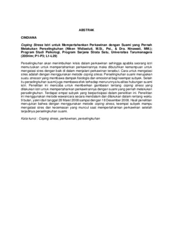 Cindiana, Cindiana (2009) Coping Stress Istri Untuk Mempertahankan Perkawinan Dengan Suami Yang Pernah Melakukan Perselingkuhan. Skripsi thesis, Universitas Tarumanagara.