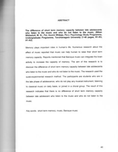Memory plays important roles in human's life. Numerous research about the effect of music reported that music can help human to raise their short term memory capacity. Reports mentioned that Baroque music can integrate the brain activity to increase the capacity of memory. The aim of this research is to discover the difference of short term memory capacity between late adolescents who listen to the music and who do not listen to the music. The research used the quasi-experimental research method. The participants are students who are in the late phase of adolescence, who do not play any musical instrument, listening to classical music on daily basis, or joined in a choral group. The result of this research indicates that there is no difference of short term memory capacity between late adolescent who listen to the music and who do not listen to the music.