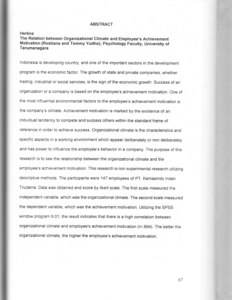 Indonesia is developing country, and one of the important sectors in the development program is the economic factor. The growth of state and private companies, whether trading, industrial or social services, is the sign of the economic growth. Success of an organization or a company is based on the employee's achievement motivation. One of the most influential environmental factors to the employee's achievement motivation is the company's climate. Achievement motivation is marked by the existence of an individual tendency to compete and surpass others within the standard frame of reference in order to achieve success. Organizational climate is the characteristics and specific aspects in a working environment which appear deliberately or non deliberately and has power to influence the employee's behavior in a company. The purpose of this research is to see the relationship between the organizational climate and the employee's achievement motivation. This research is non experimental research utilizing descriptive methods. The participants were 147 employees of PT. Kemasindo Indah Triutama. Data was obtained and score by liked scale. The first scale measured the independent variable, which was the organizational climate. The second scale measured the dependent variable, which was the achievement motivation. Utilizing the SPSS window program 9.01, the result indicates that there is a high correlation between organizational climate and employee's achievement motivation (r=.894). The better the organizational climate, the higher the employee's achievement motivation.
