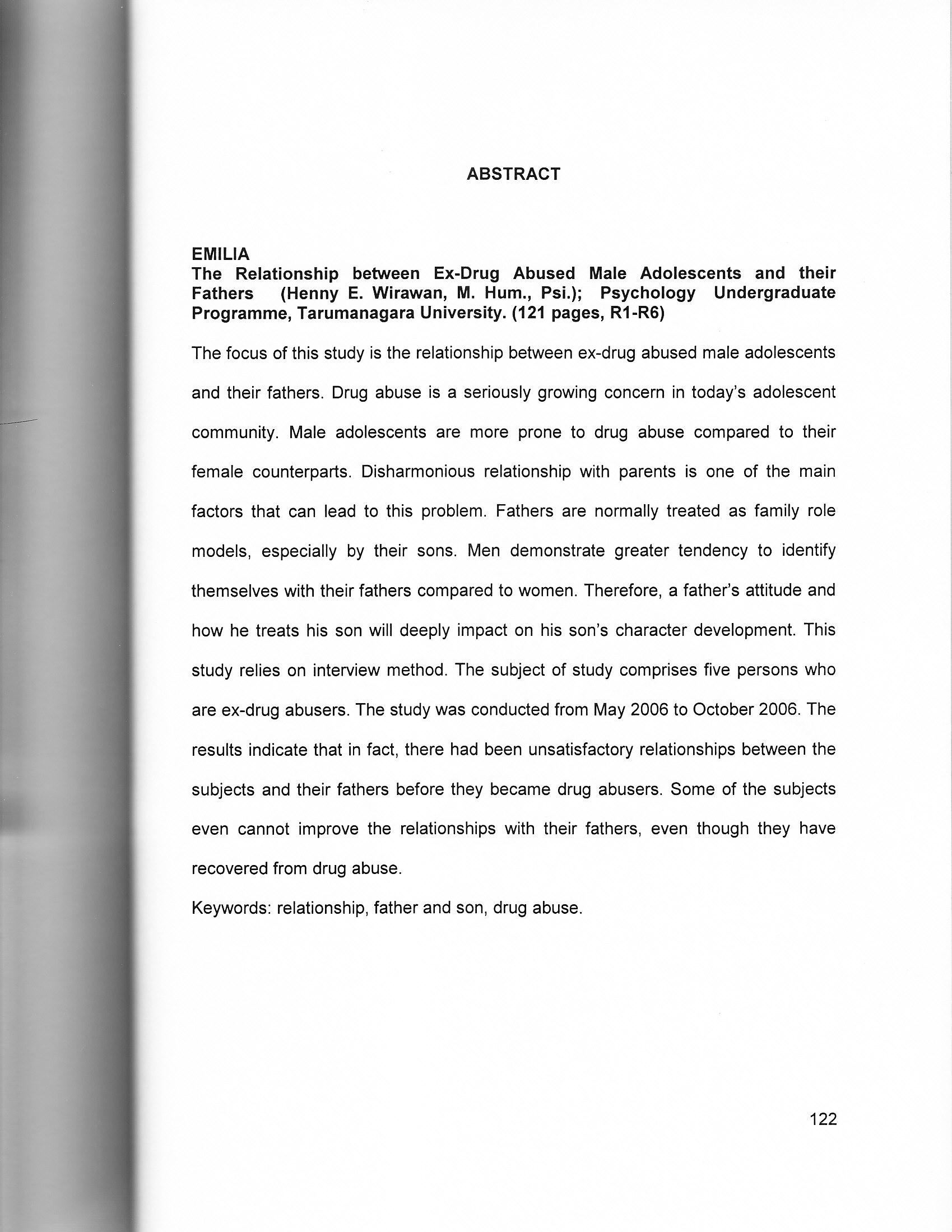 Emilia, Emilia (2007) Relasi Remaja Pria Mantan Penyalahguna Narkoba Dengan Ayahnya. Skripsi thesis, Universitas Tarumanagara.