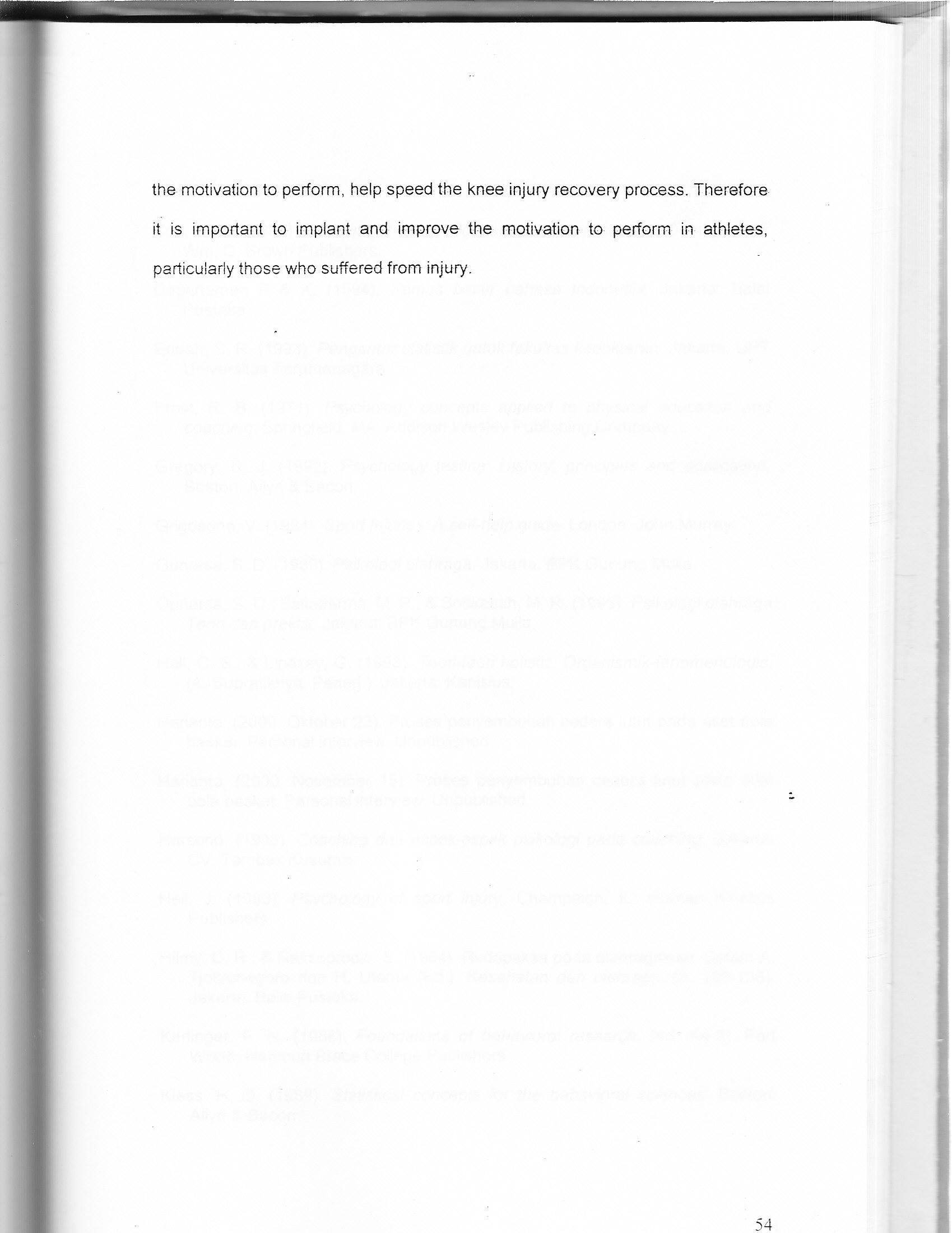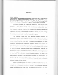 Injury is an inevitable risk at which an athlete runs, particularly at sports that involve a lot of physical impacts in his activities such as basketball. Injury does not enable an athlete to perform the activities in the sports. An athlete who suffers from an injury, if he has a high motivation to recover, will soon undergo the recovery process in order to perform maximally in sports. The objective of this study is to see the correlation between the perception on an injury with a motivation to recover in the professional basketball athletes who suffered from knee injury. This is a correlational study. This study involves 20 respondents of professional basketball athletes who suffered the injury and they have recovered from injury that they suffered, aged 19-30 and are still active in Perbasi. Data are collected using a questionnaire measures the perception on an injury and motivation to recover. The data processing is carried out using the SPSS for Windows release 9.0 statistic program. The result of the data processing is linked to the secondary ones that are obtained from the interview with DR. Harianto (an Orthopedist who frequently treats professional basketball athletes who are injured). The study result suggests that there is a positive correlation between the perception on an injury and motivation to recover in the professional basketball athletes who suffered from knee injury. The motivation to recover, in this case, the motivation to perform, help speed the knee injury recovery process. Therefore it is important to implant and improve the motivation to perform in athletes, particulary those who suffered from injury.