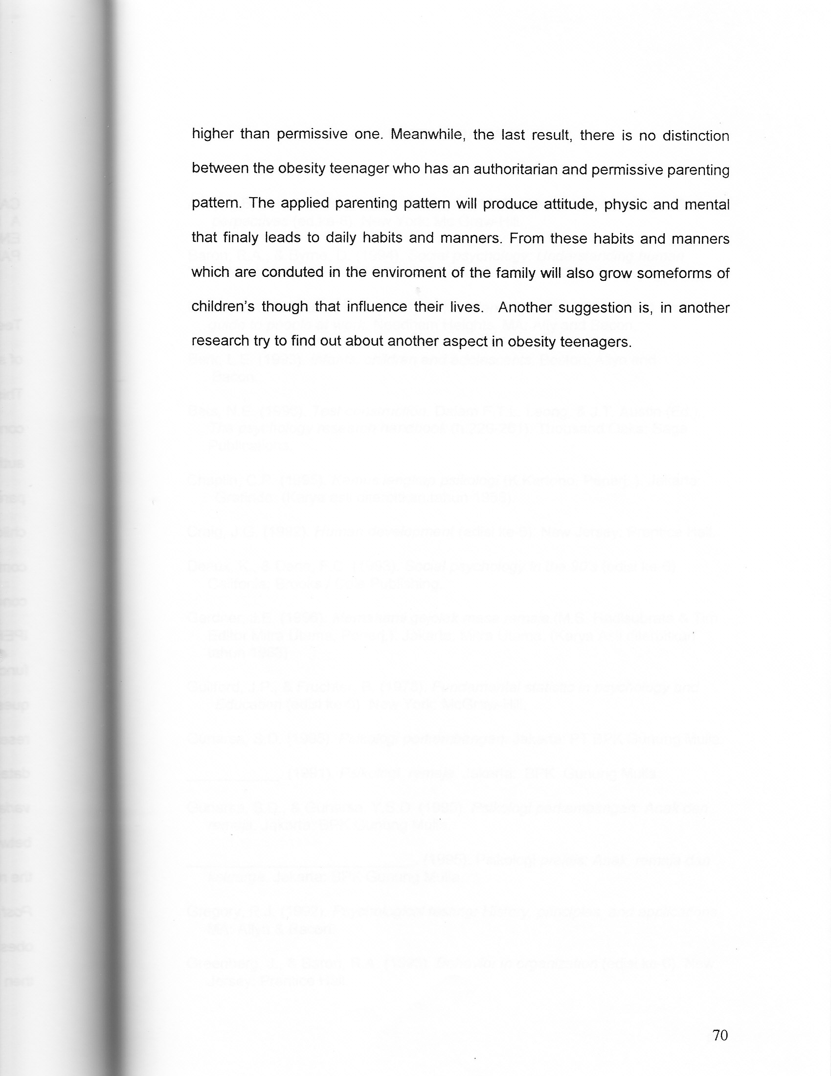 Teenagers are a hard period, because they need to find their self and the shape of self concept begin in teenagers periode. This research is conducted purposely to know whether there is a distiction of self concept on obesity teenagers who are encountered authoritarian, permissive and authoritative parenting patterns. The understanding of parenting pattern is the parent's treatments in order to fulfill in needs, giving protection, and educating children in everyday life. Self concept in this research refers to the unique composition of perception, judgement, attitude, ways of thinking, dan individuals concience. The number of subjects in this research were 50. All of them study at IPEKA High School Tomang, West Jakarta. They filled the questionnaires which function as the barometer of this research. All the answer for the statement in this questionnaires were in the form of continuum scale. The data processing in this research was using the SPSS computer program for windows release 10.0. The data calculation was done by Post Hoc/Multiple comparisons tes and analysis of variance (F-test). By the analysis of variance (F-Test), show there is a distinction between three authoritarian, permissive and authoritative parenting pattem. Then the researcher expand the counting to compare each two parenting pattem using Post Hoc/Multiple comparison test from the resul of self concept, and the result is obesity teenagers self concept who has authoritative parenting pattem is higher then authoritarian one. Further more, the other result is the obesity teenagers is higher than permissive one. Meanwhile, the last result, there is no distinction between the obesity teenager who has an authoritarian and permissive parenting pattern. The applied parenting pattern will produce attitude, physic and mental that finaly leads to daily habits and manners. From these habits and manners which are conduted in the enviroment of the family will also grow someforms of children's though that influence their lives. Another suggestion is, in another research try to find out about another aspect in obesity teenagers.