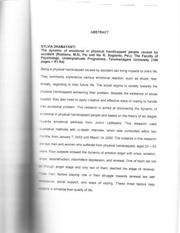 DHAMAYANTI, SYLVIA (2002) Dinamika Emosi Penyadang Tuna Daksa Pasca Kecelakaan. Skripsi thesis, Universitas Tarumanagara.