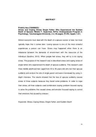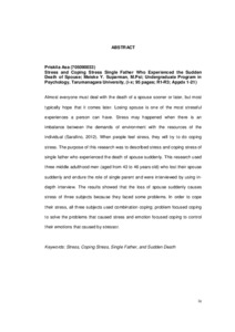 Almost everyone must deal with the death of a spouse sooner or later, but most typically hope that it comes later. Losing spouse is one of the most stressful experiences a person can have. Stress may happened when there is an imbalance between the demands of environment with the resources of the individual (Sarafino, 2012). When people feel stress, they will try to do coping stress. The purpose of this research was to described stress and coping stress of single father who experienced the death of spouse suddenly. This research used three middle adulthood men (aged from 43 to 46 years old) who lost their spouse suddenly and endure the role of single parent and were interviewed by using in- depth interview. The results showed that the loss of spouse suddenly causes stress of three subjects because they faced some problems. In order to cope their stress, all three subjects used combination coping; problem focused coping to solve the problems that caused stress and emotion focused coping to control their emotions that caused by stressor.