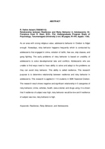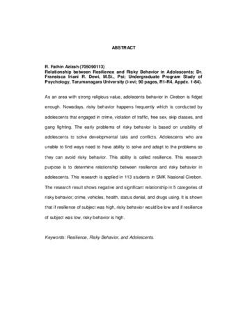 As an area with strong religious value, adolecents behavior in Cirebon is fidget enough. Nowadays, risky behavior happens frequently which is conducted by adolescents that engaged in crime, violation of traffic, free sex, skip classes, and gang fighting. The early problems of risky behavior is based on unability of adolescents to solve developmental taks and conflicts. Adolescents who are unable to find ways need to have ability to solve and adapt to the problems so they can avoid risky behavior. This ability is called resilience. This research purpose is to determine relationship between resilience and risky behavior in adolescents. This research is applied in 113 students in SMK Nasional Cirebon. The research result shows negative and significant relationship in 5 categories of risky behavior; crime, vehicles, health, status denial, and drugs using. It is shown that if resilience of subject was high, risky behavior would be low and if resilience of subject was low, risky behavior is high.