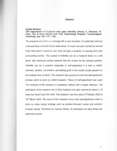 The presence of a child in a marriage life is very important, it's belief that child can unite and keep complete family relationship. A couple who gets married for several times that haven't presence own child will gets a question or warning from their surrounding society, The caused of infertility can be a husband factor or a wife factor. But commonly people believes that the women as the sources problem. Infertility can be a problem especially in self-adjustment if a man is infertil. Sadness, useless, unconfident, and feeling guilty to the couple usually appears on the husband who is infertil. This research has purpose to know the self-adjustment process which is done by infertil husband. Theory of self-adjustment was used. The methods of this research is qualitative method with in-depth interview. The participant of this research are 5 (five) husband who gets married for about ± 10 years but haven't got first child. This research was from about 2ndOctober 2002 to 16th March 2003. The result of this research shows that self-adjustment which is done by using coping strategy such as problem-focused coping and emotion-focused coping. Perceived by Lazarus theory, all participant are also being self-adjusment proces.